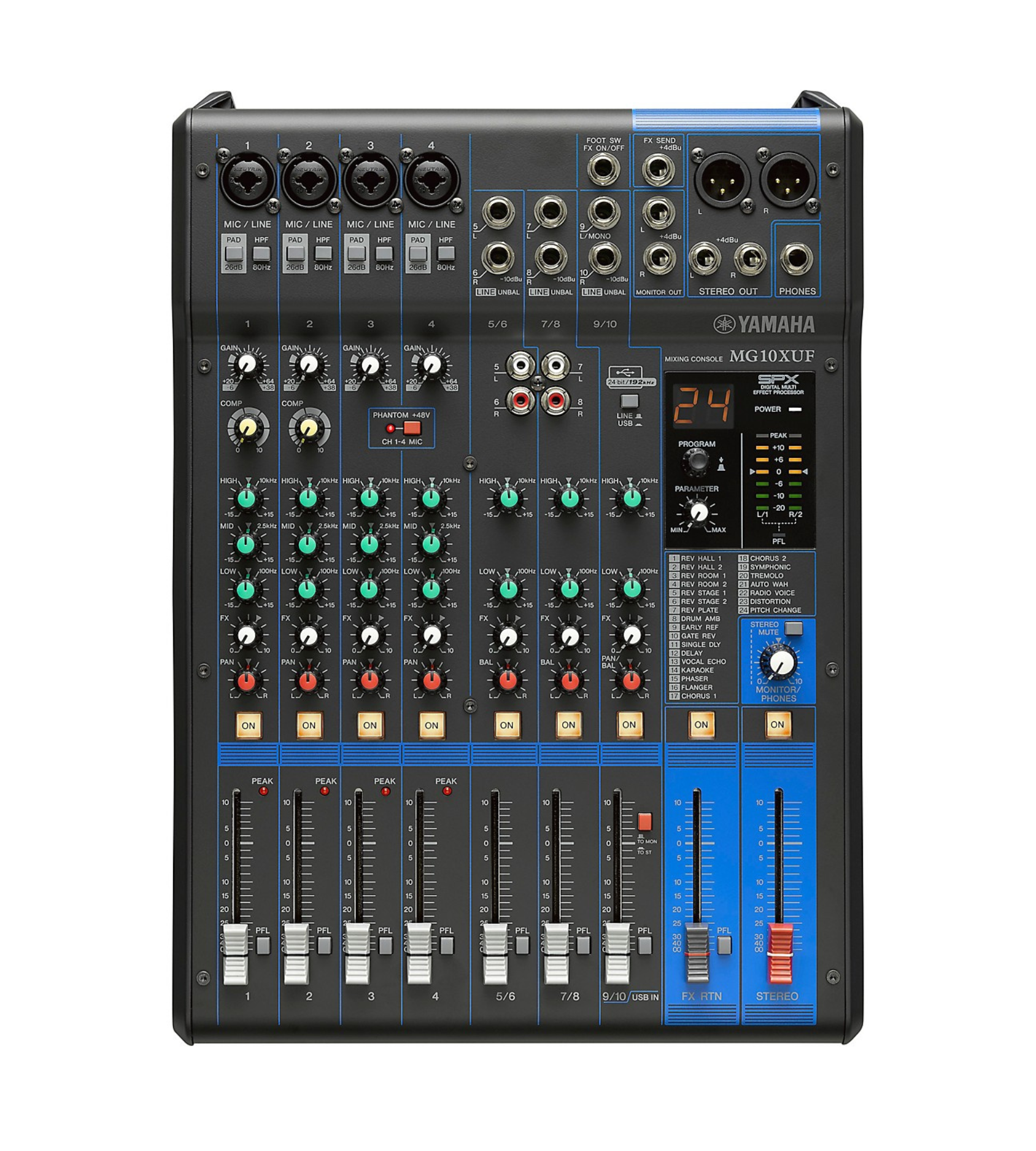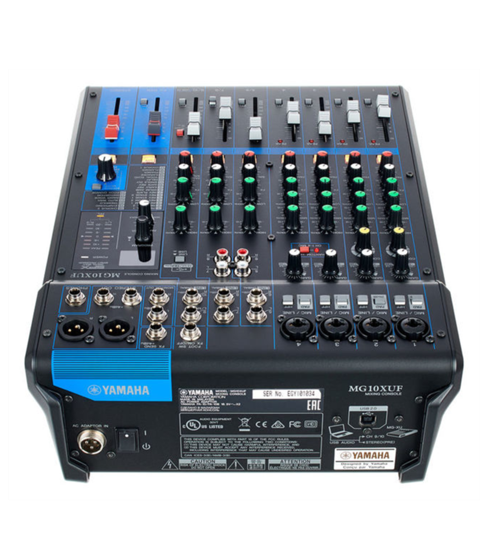 - 10 input channels: 4 mono (mic/line) with +48 V phantom and high-pass filters, plus 3 stereo line channels