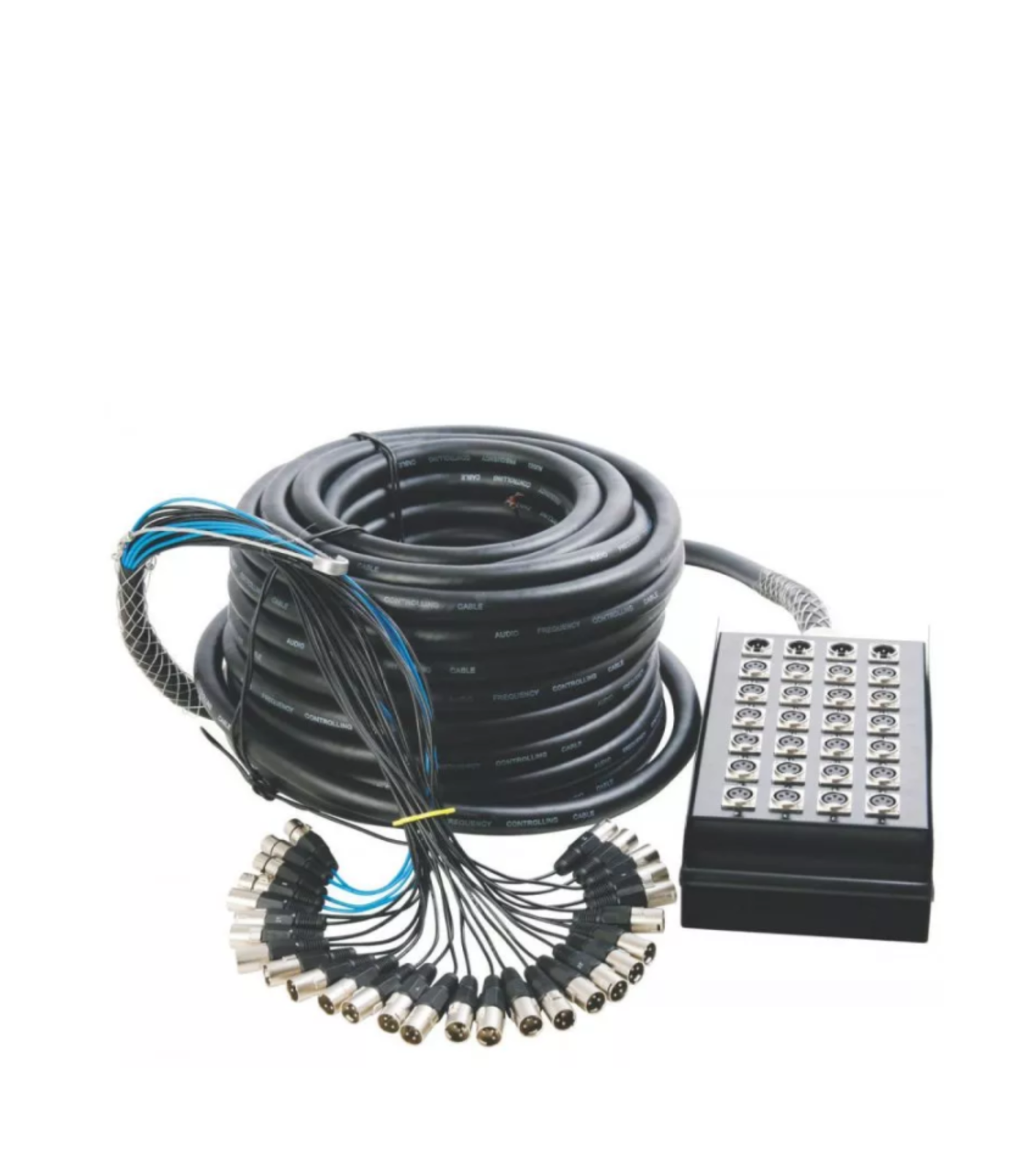 Our SNK244100v2 100' 24-Channel/4-Return Stage Snake neatly bundles 24 XLR channels from a stage or studio to a mixer and four XLR returns to stage monitors or headphones, eliminating the need to run multiple long cables. For secure, efficient set up and teardown, quick-release connectors lock in connections yet easily disconnect with the push of a button. OFC wiring increases conductivity and resists corrosion while hand-soldered, individually insulated connectors prevent short circuits. Flexible cable bundling with strain relief and a heavy-duty stage box protect internal components to ensure reliable operation. The built-in box handle facilitates ergonomic carrying.