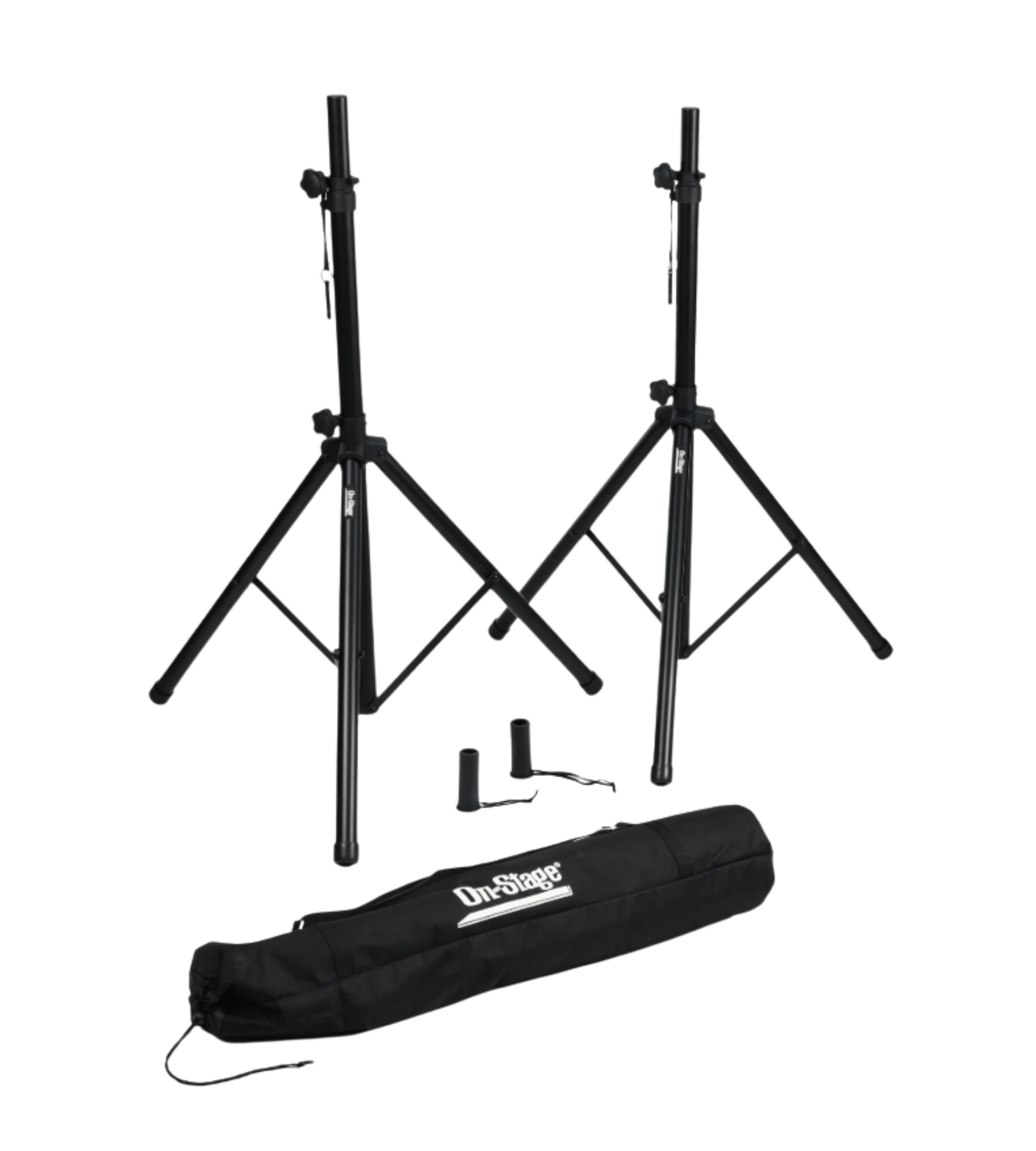 Our light-weight SSP7900 All-Aluminum Speaker Stand Pack comes with everything needed to support two speakers on individual stands. The stands feature versatile adaptable poles that support all standard speaker cabinet mounting sockets and their height adjusts to accommodate a variety of applications. Heavy-duty construction, braced bases, and nonslip feet work together to deliver exceptional stability and load balance even on irregular surfaces. The durable black finish preserves the professional appearance of any space. For convenient storage and ergonomic transportation, the tripod bases fold flat and all the components fit into an included carrying bag with an ergonomic shoulder strap.