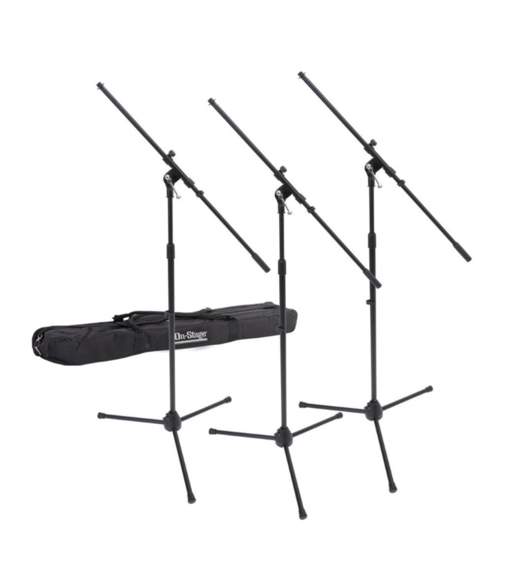 This pack of three of our height-adjustable MSP7703 Euro Boom Mic Stands is ideal for a touring band or mobile recording rig. This stand delivers exceptional stability in any setting, even on irregular surfaces. The removable boom arm adjusts in angle for precise mic placement, making it a versatile choice that excels in a variety of applications ranging from miking vocals to acoustic instruments to amps. The entire stand conveniently folds flat to facilitate storage and travel. This pack includes a rugged padded nylon bag with a shoulder strap and top handles for ergonomic transportation.