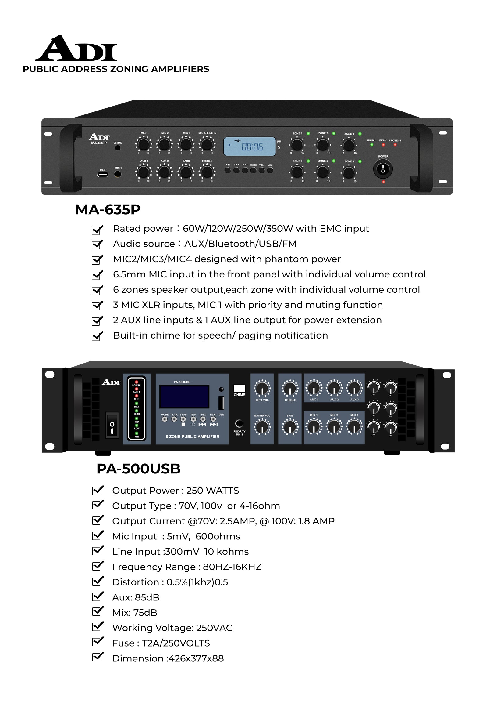 Deliver powerful and precise sound where it’s needed most with the ADI PA500 Zoning Amplifier. Built for multi-zone audio systems, this amplifier provides clear, consistent power distribution while allowing flexible control across different areas. Rugged, efficient, and designed for professional use, it’s the perfect choice for commercial spaces, institutions, and venues that require reliable amplification and seamless zoning capabilities.