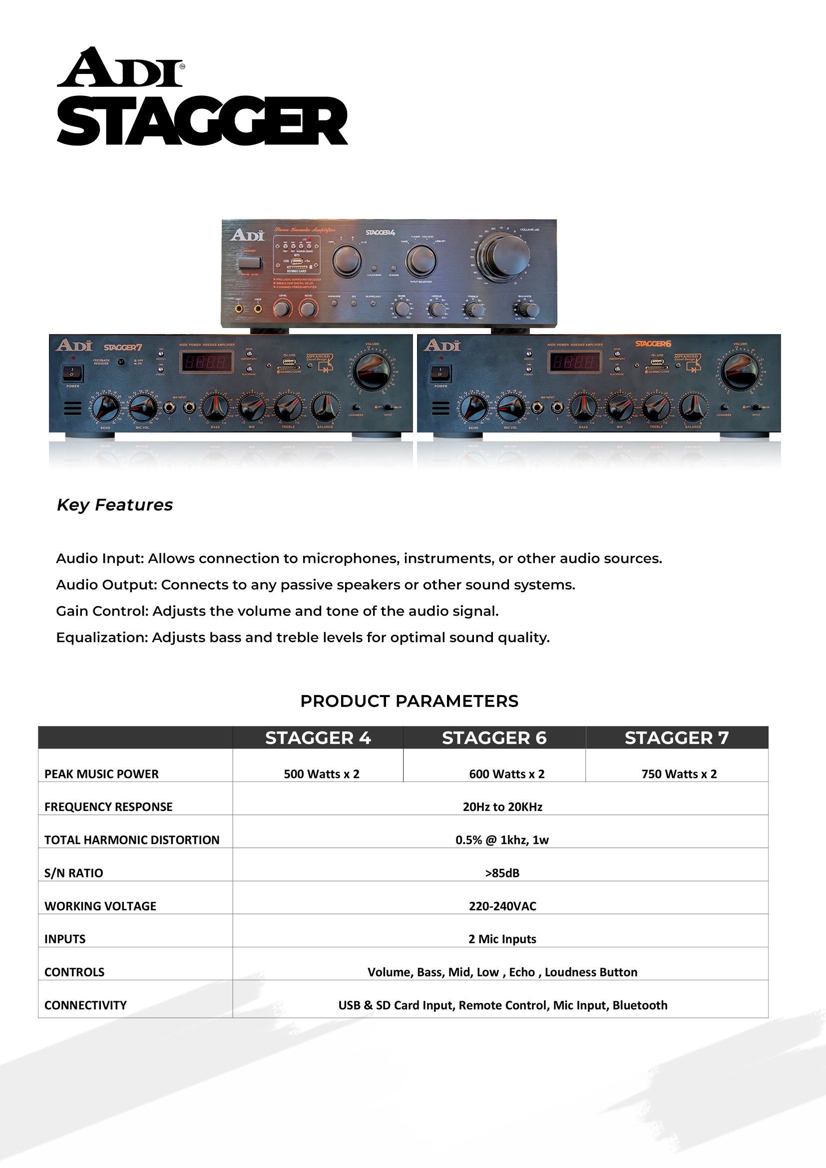 Experience exceptional sound quality with ADI Karaoke Amps, designed specifically for home audio systems and the ultimate karaoke setup. Whether you're hosting a karaoke night or simply enjoying your favorite tunes, these amps deliver powerful, crystal-clear audio to enhance your experience. Compatible with any type of passive speaker, ADI Stagger Amplifiers provide seamless connectivity and easy controls, making them the ideal choice for music lovers who want a versatile and immersive sound system at home.